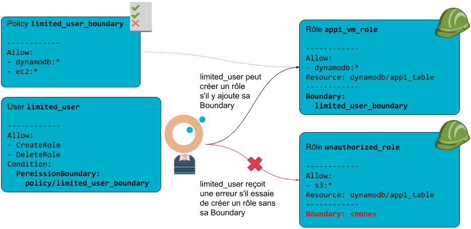 Dans la figure 4, l'administrateur central a autorisé limited_user à créer et supprimer des rôles, mais uniquement sous condition que la Boundary soit associée au rôle. L'API AWS bloquera les appels qui ne respectent pas cette condition.