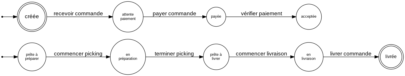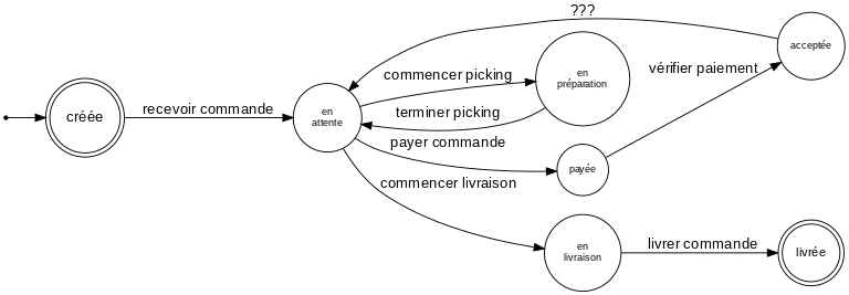 Lorsque l'on modélise nos processus, il arrive fréquemment qu'on tombe sur une modélisation dite d'automate fini. Ces modèles sont pratiques car faciles à visualiser et à décrire. Sans s'engager complètement dans leur formalisme, ils gardent un grand pouvoir explicatif. Par exemple, pour mon exemple de système de livraisons de commandes.