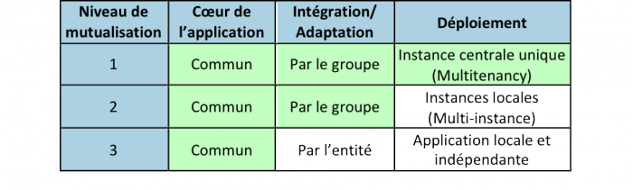 En complément de la gestion des fonctionnalités, on doit aussi définir le niveau de mutualisation de ressources pour l’intégration, l’adaptation et le déploiement dans les entités. En fonction de l’homogénéité et le niveau de centralisation cible, on peut définir plusieurs niveaux de mutualisation de l’application: