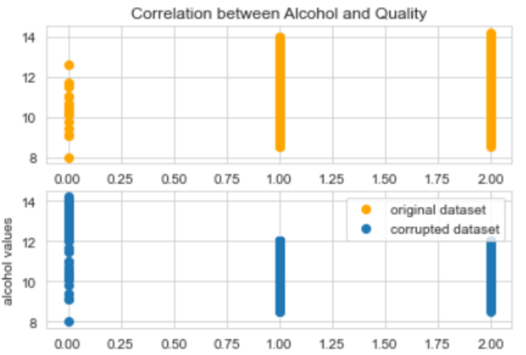 As we can see from the below plots: the correlation between Alcohol and Quality in the corrupted dataset is different from the correlation in the original dataset. Look at the trend: in one plot, it is a positive correlation and in the other one, it is negative.