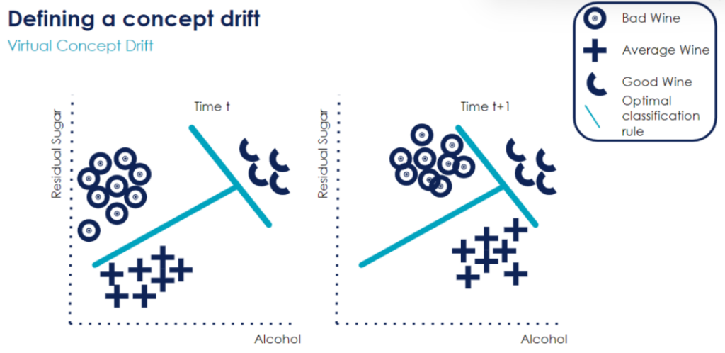 A virtual concept drift happens when the data shifts but the relationship between the target variable and its predictors remains the same. Let’s take an example with our wine quality classification problem: we use two variables (Residual Sugar and Alcohol) to classify a wine as “Bad”, “Average” or “Good”. We can see that between time t and time t+1, some points have drifted to the right (more alcohol). In other words, the alcohol feature has changed. Yet, there has been no change in the optimal classification boundary: this is why it is called virtual concept drift.