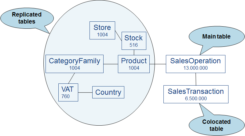 Stock, and Store could be seen as other candidates for a second main concept. However, notice the problem on the Product table: if you look back to the database schema you will see that one line in of the Product is related to several inventories (Stock) and several transactions. How to partition such a table? It is impossible. Why not replicate it? Another limitation of SQLFire is that for standard SQL queries, execution plans including joins have to be collocated (a stricter definition of these limitation is described in the documentation). We had to use an alternative syntax for queries between Store and Product. Moreover the transaction design is highly optimized for collocated data as explained here. But the best and most simple argument is that Store and Stock are very small compared to SaleOperation and SaleTransaction tables and they will never grow. We therefore decided to replicate them.