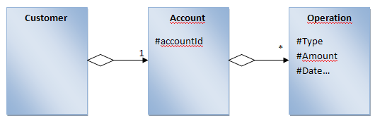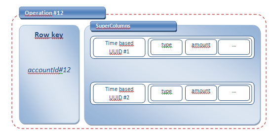 To begin with the simplest things, the replicationFactor defines the number of nodes the data will be replicated. Then let’s talk about the ColumnFamily. First, you will notice that the schema for each ColumnFamily is not defined (whereas the actual 0.6 version of Cassandra does not allow dynamically adding or removing ColumnFamily, the 0.7 should provide this feature) and you only know that customers and operations will be stored. Data modeling If you look at the UML diagram representing the different concepts, you will notice that there is a “one-to-many” relationship between an account and the operations on this account. An easy way to model this in Cassandra is by using the SuperColumn. Thus the operation has the following structure: