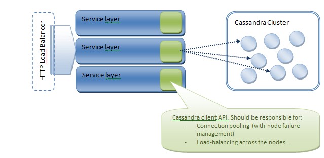 Cassandra is called using Thrift (even if the 0.6 version introduced Avro protocol). As we told previously, Cassandra is responsible for routing the request to the proper node so you can reach any node of your cluster to serve your request. Nonetheless, the default thrift client API does not provide any load-balancing or connection pool mechanisms. Concerning the connection pool, the main lacks, in my opinion, are (1) the capacity to close and reopen connections in case a node has failed, (2) the capacity to load-balance requests among all the nodes of the cluster and (3) the capacity to automatically request another node when the first attempt fails. A higher level of load-balancing could be setup on the service layer