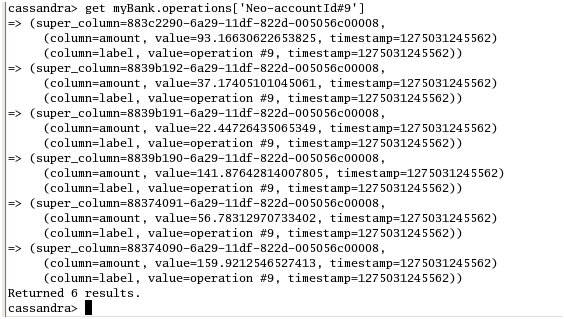 This case is different from the previous one. Instead of adding the previously defined Columns to the row, we create a SuperColumn with a dynamic (and time-based UUID) name...Quite dynamic isn't it? Then, the three columns are added to the super column itself. The end of the code is similar to the previous one. The row is added to the ColumnFamily named operations and then associated to the current customer account id.