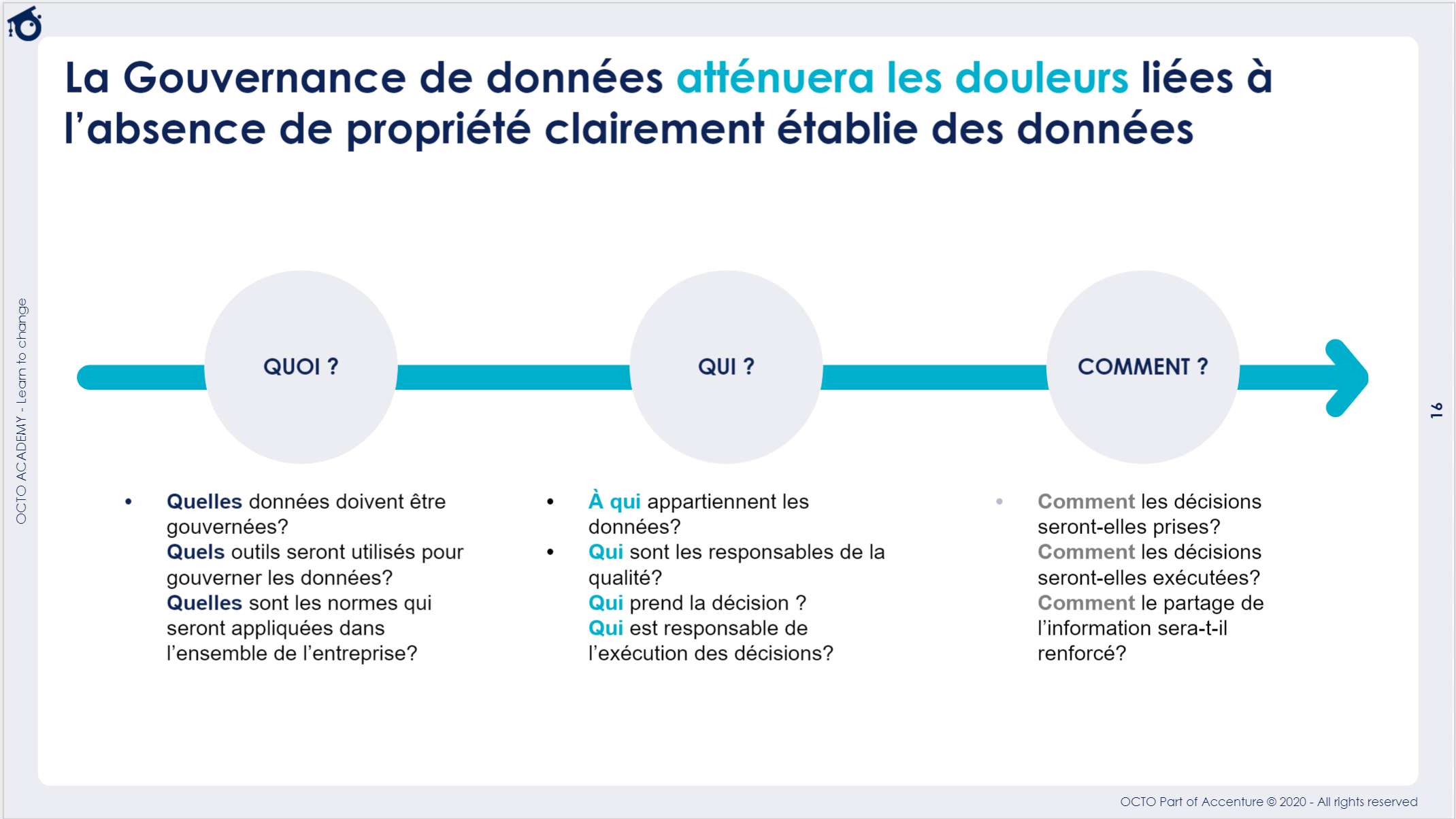 - Gouvernance : créer une organisation et pouvoir animer une communauté autour des données pour les mettre au centre de l'entreprise.