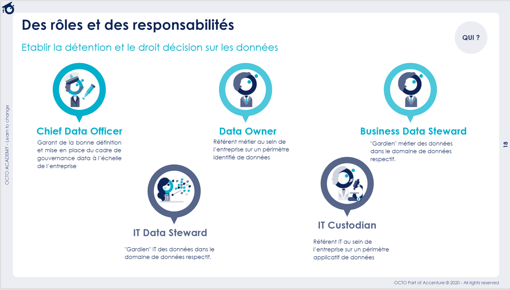 Cela permet également d’identifier plus rapidement la personne sur laquelle on peut s'appuyer et que l’on peut contacter s'il y a des questions, s'il y a une demande d'accès, s'il y a des requêtes autour de la donnée… Il y a quelques rôles standards mais pas de rôles type à appliquer. Ils seront à préciser en fonction de l'entreprise, de son type d'organisation.