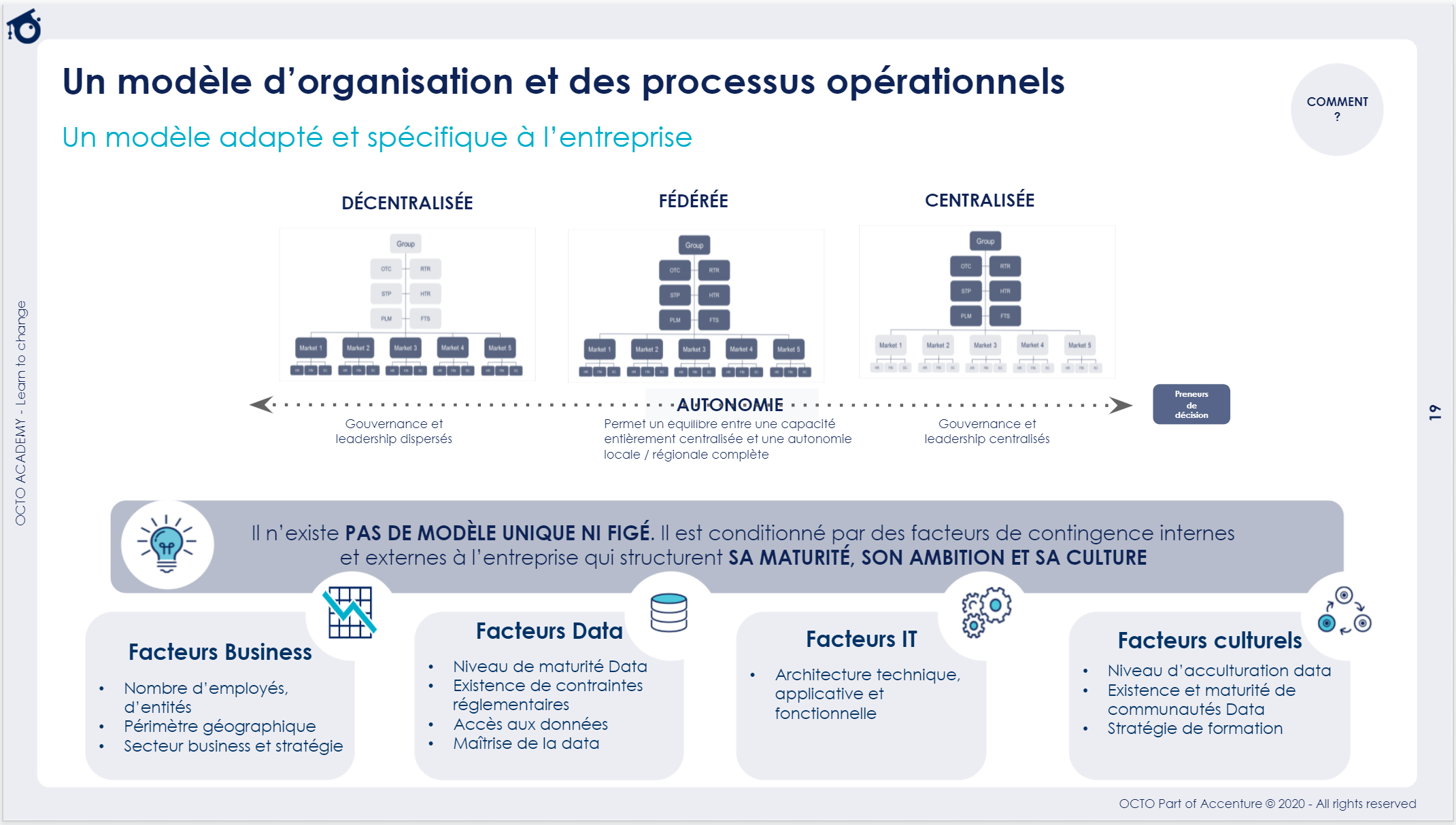 Dernier pilier indispensable à la gouvernance : les process et le modèle d’organisation pour structurer l'utilisation de la donnée. Plusieurs types de modèles sont possibles dont les 3 principaux "centralisé, décentralisé, fédéré" mais de plus en plus, de nouveaux types apparaissent qui sont beaucoup plus spécifiques à des produits.