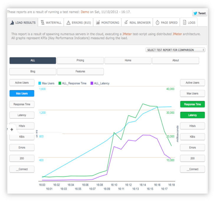 Looking at the figure below, we have a simple example of run report, where we can see the results of a 18 minutes test , having a limit of 1,300 concurrent users, with a ramp up of 100 users per minute.