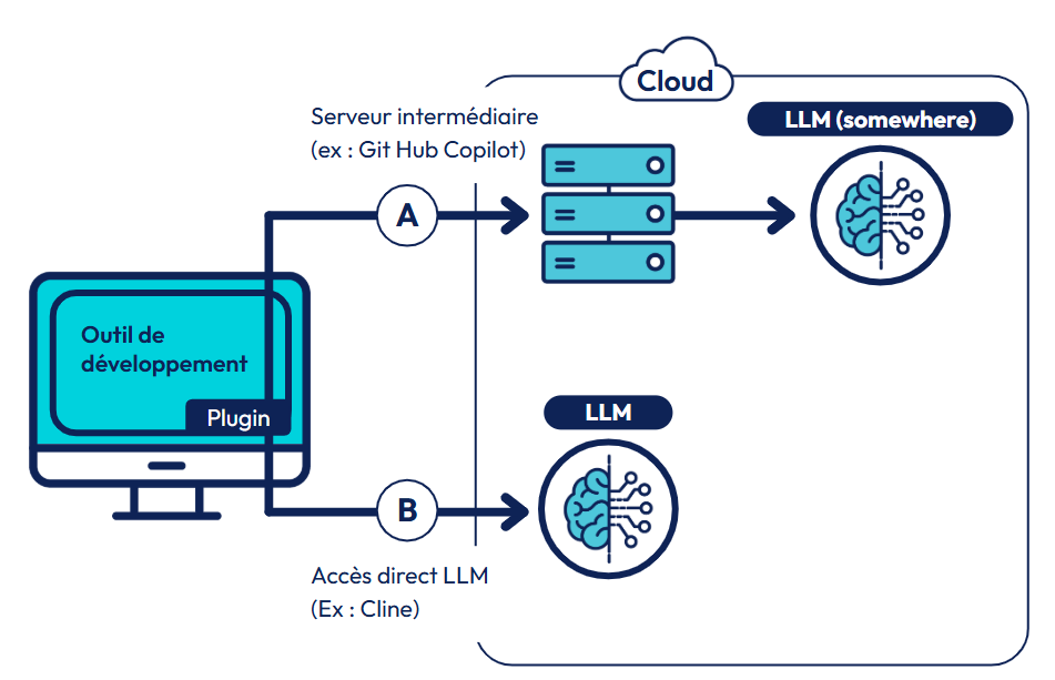 - Serveur intermédiaire propriétaire (A) : Le plug-in, installé dans l’IDE, se connecte à un serveur du fournisseur qui sollicite ensuite de manière plus ou moins opaque le LLM. C’est le fonctionnement de la plupart des produits commerciaux comme par exemple GitHub Copilot,