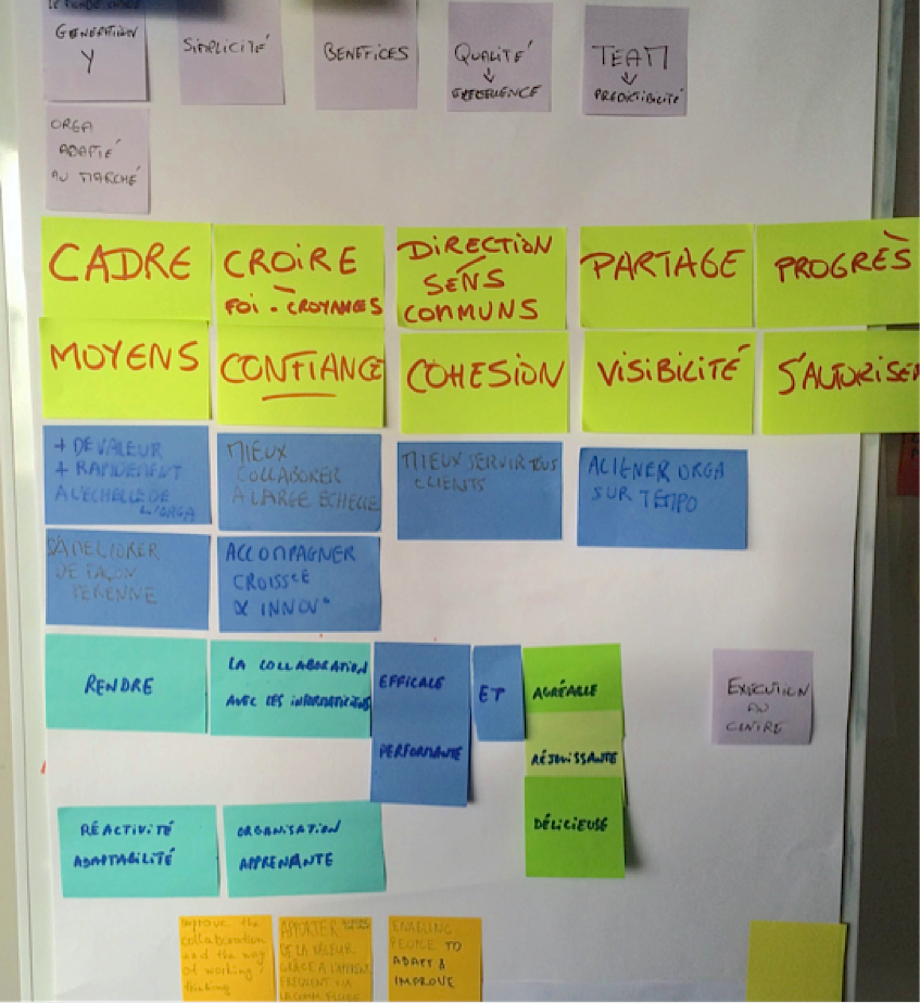 1. Définir votre Pourquoi : donner aux participants 10 minutes pour réfléchir et écrire sur les notes adhésives le sens d’existence de son entité. Regrouper les notes et écrire le Pourquoi.