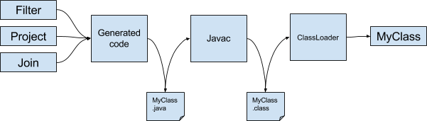 Dans le code de Spark, la mécanique est assez proche, mais tout le processus de compilation du code source et de récupération de la classe compilée est délégué à la librairie Janino qui a l’avantage d’être plus rapide que l’appel au compilateur Java classique car elle réalise toutes les opérations en mémoire (pas besoin d’écrire le fichier source dans un fichier temporaire en amont).