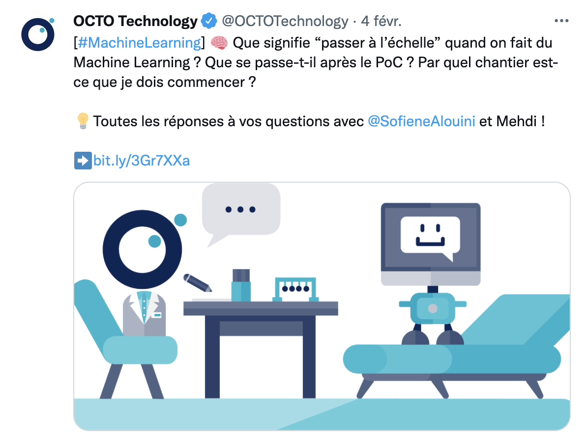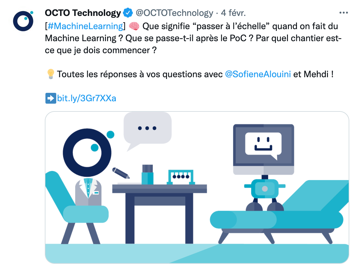 Prenons comme fil rouge ce tweet publié par le compte Twitter @OCTOTechnology, qui nous permettra d’illustrer de nombreux traitements utiles en NLP :
