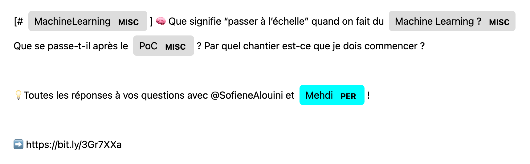 >>> text = """[#MachineLearning] 🧠 Que signifie “passer à l’échelle” quand on fait du Machine Learning ? Que se passe-t-il après le PoC ? Par quel chantier est-ce que je dois commencer ?