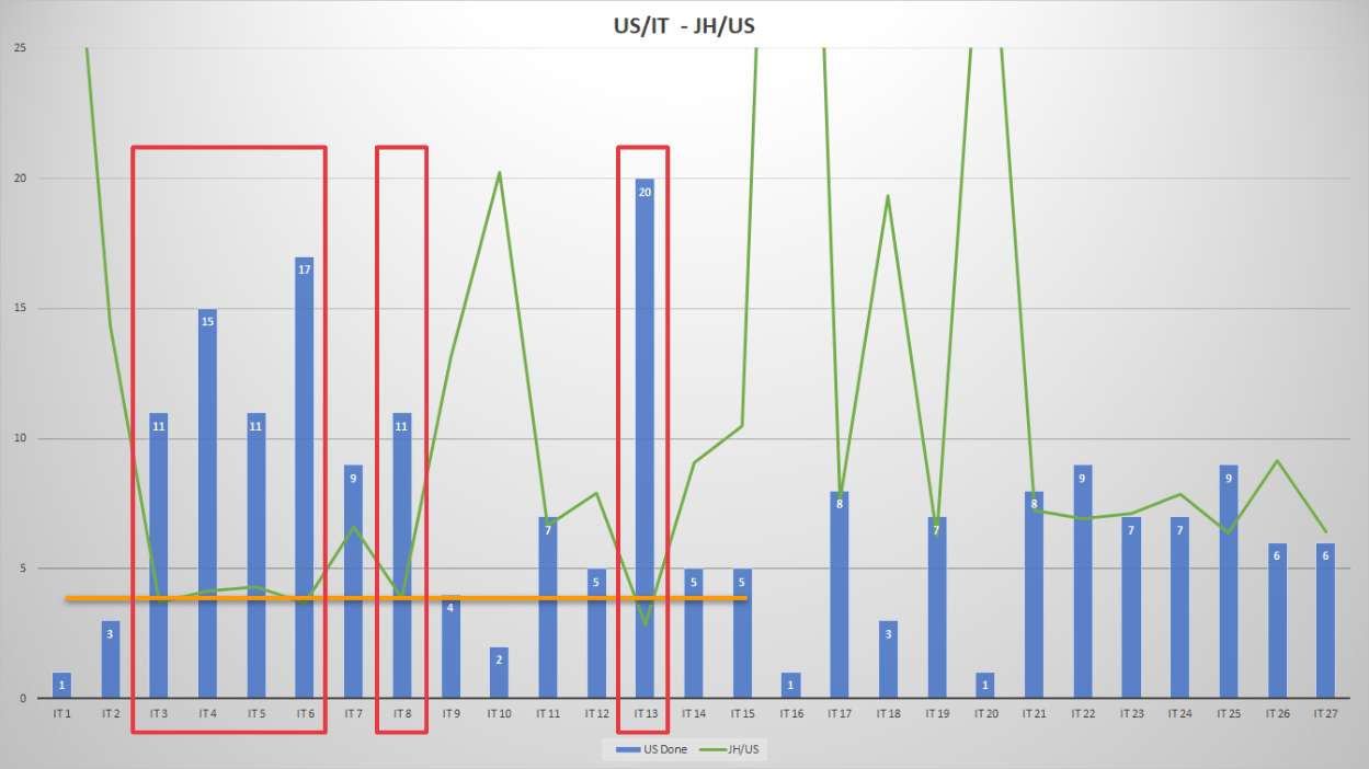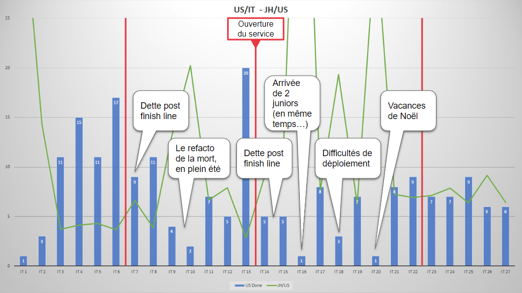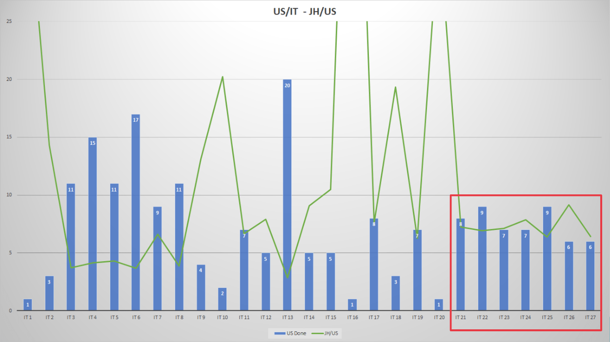 Afin de pouvoir comparer plus justement nos itérations les unes aux autres, nous avons choisi d’introduire dans nos métriques la notion d’ETP (Equivalent Temps Plein, exprimés en Jours-Hommes - JH) disponibles sur la période. Utilisant cette notion, nous avons construit un indicateur simple : le nombre d’ETP moyen nécessaire à la production de chaque US livrée - soit le nombre de Jours-Hommes disponibles sur la période divisé par le nombre d’US livrées - et nous avons ajouté cette courbe au graphique. La courbe verte sur ce graphe représente le nombre de JH par US à chaque itération. Plus elle est basse, moins la production d’US a nécessité d’effort : à l’inverse, plus elle est élevée plus la production d’US a été coûteuseLa courbe verte sur ce graphe représente le nombre de JH par US à chaque itération. Plus elle est basse, moins la production d’US a nécessité d’effort : à l’inverse, plus elle est élevée plus la production d’US a été coûteuse.