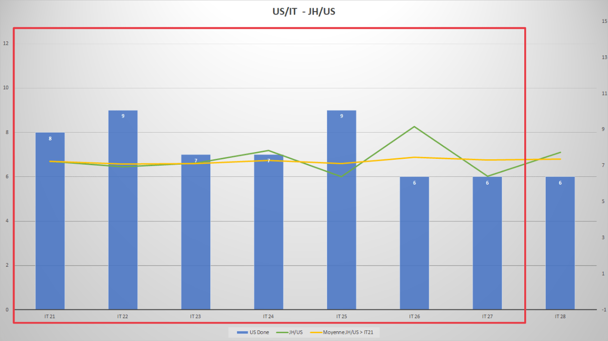 Cette zone de stabilité est encadrée en rouge ci-dessous. Elle s’est poursuivie au-delà des itérations présentées sur ce graphe : Ce second graphe présente le détail de la période stabilisée (encadrée en rouge au dessus), et la moyenne de JH par US correspondante, en jauneCe second graphe présente le détail de la période stabilisée (encadrée en rouge au dessus), et la moyenne de JH par US correspondante, en jaune : En utilisant cette moyenne et en la rapportant à nos prévisions d’ETP disponibles dans l’équipe, nous avons pu simplement projeter nos livraisons prévisionnelles sur la base du burn-up chart.