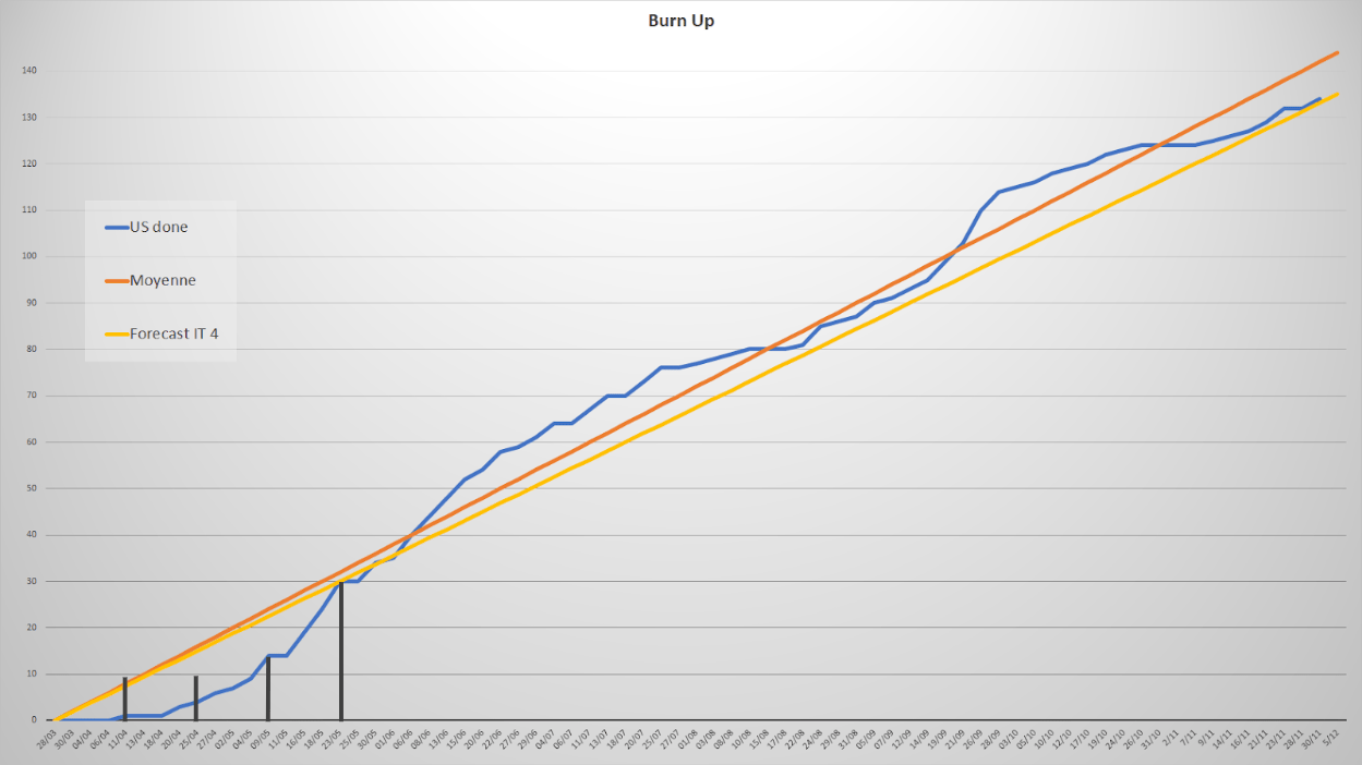 Notons tout de même que le choix du nombre d’itérations à considérer pour tracer la projection (3, 4, 5, voire plus) doit être fait en conscience. Il s’agit de savoir déterminer lorsque l’équipe est entrée dans un rythme nominal. Dans notre cas, 4 itérations ont été nécessaires.