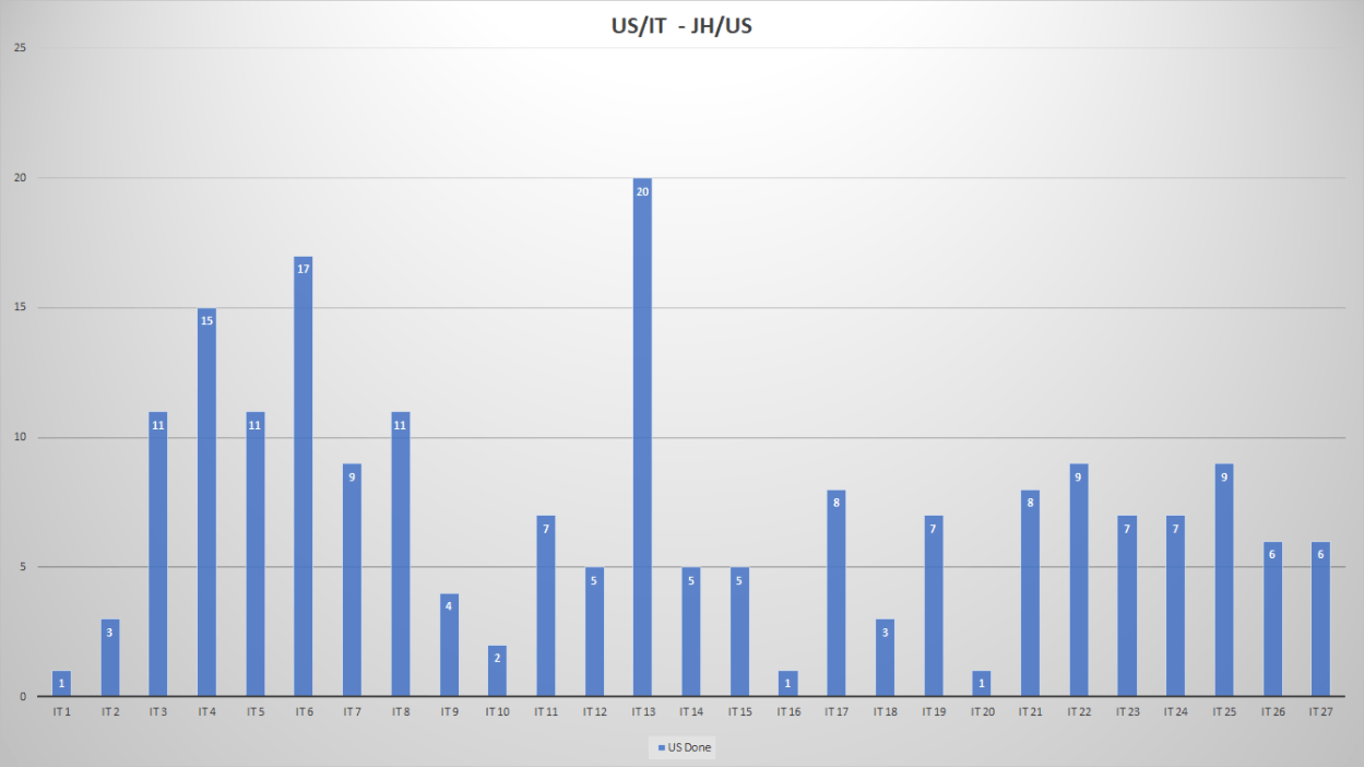 Pour assurer notre prédictibilité, nous devons assurer notre régularité : c’est un principe de base. Or, on constate sur le graphe ci-dessous présentant le nombre d’US produites par itération que ce nombre varie de manière importante.