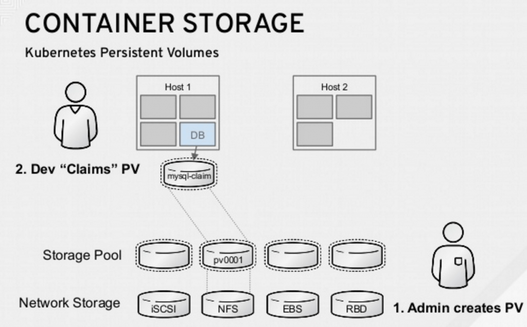 Les mécanismes internes de Kubernetes font ensuite le mapping entre les PV et les PVC permettant ainsi d’abstraire complètement pour les pods le système de stockage sous-jacent.
