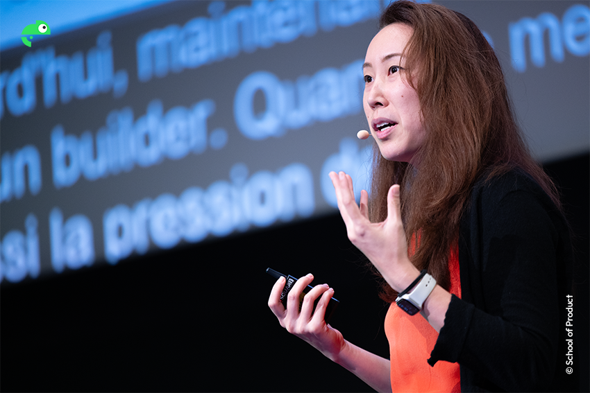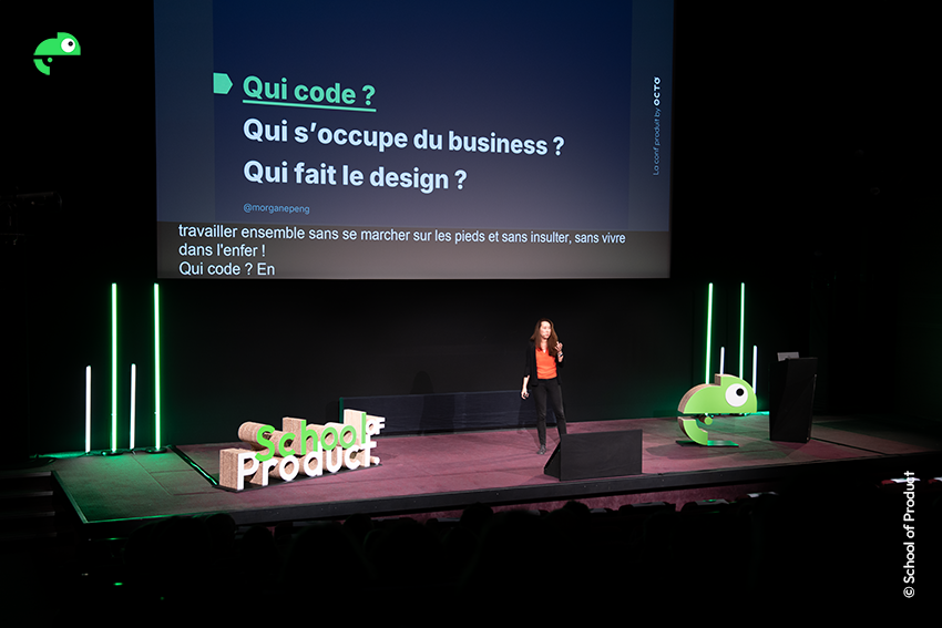 Morgane Peng est sur la scène et montre une diapositive sur laquelle on peut lire : Qui code ? Qui s'occupe du business ? Qui fait le design ?