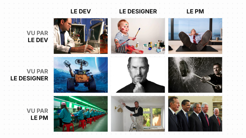 Outre les personnalités différentes dans l’équipe qui peuvent éventuellement être problématiques (des gens qui ne répondent pas à des messages, qui ne viennent plus…), chacun porte une vision très subjective de son rôle et de celui des autres. Ces représentations, puisque répondent à une perception personnelle, ne sont pas partagées et créent des malentendus. Cette image l’illustre avec une certaine comicité : le PM voit le dev comme un exécutant, le dev voit le désigner comme un artiste dilettante et le designer voit le PM comme quelqu’un qui détruit tout.