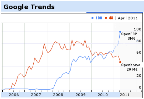 OpenERP c'est 185 employés en Belgique, Inde et États-Unis, 200% de croissance en 2011, 32% du budget investi dans la R&D, environ 1 000 installations par jours et plus de 1 000 modules développés. 2010 a été pour la société OpenERP l'année d'une transition dans le business model. La société a arrêté ses activités de conseil et d'intégration et est passée à un statut d'éditeur. L'accent va donc être mis sur le développement du réseau de partenaires et leur accompagnement. On compte aujourd'hui plus de 300 partenaires dans 60 pays. Et d'après les tendances de recherche google, OpenERP passerait devant ses principaux concurrents opensource en termes de visibilité tout en ayant levé moins de fonds :