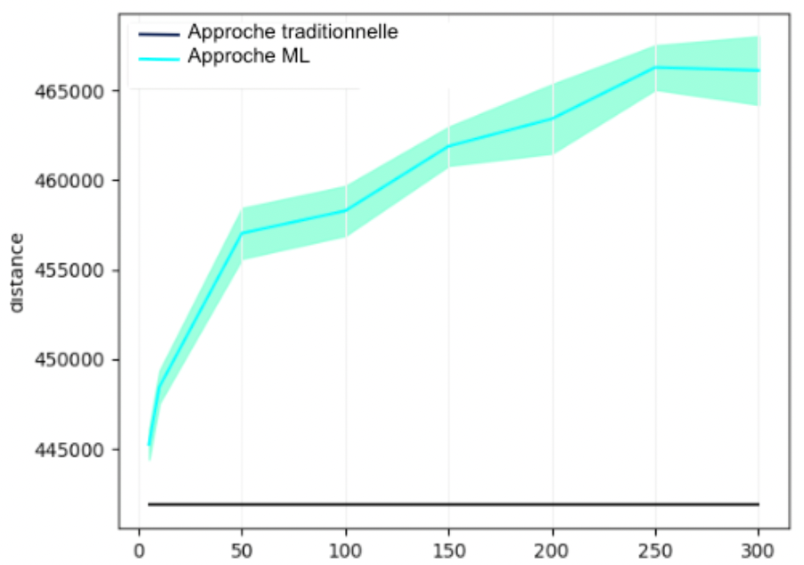 Figure 10 : Distance moyenne des parcours proposés par l'approche ML avec un intervalle de confiance à 95% sur l'instance : Chine.