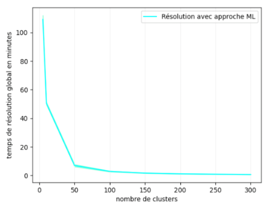 La figure 9 montre le comportement du temps de calcul de l'approche machine learning sur une échelle linéaire. Nous pouvons constater qu'en plus de la perte significative en performances quand nous augmentons le nombre de clusters, le gain en temps de calcul devient très petit, voir insignifiant. Nous ne gagnons pas plus de 7 minutes en moyenne en passant de 50 à 300 clusters et moins d'une minute en passant de 150 à 300 clusters.