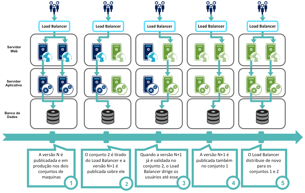 - o Load Balancer tira a(s) outro(s) conjuntos(s) de maquinas, de maneira incremental se tem varios, para sobir de versão até a N+1 e coloca de novo na distribuição de carga.