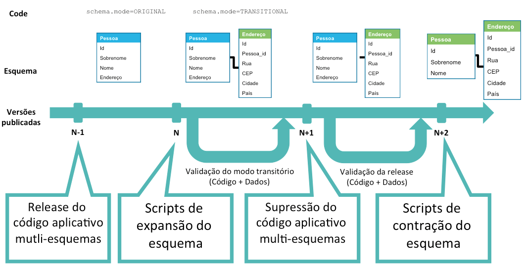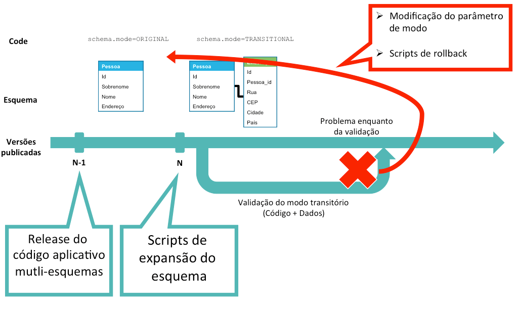 Tal problema aparece no segundo passo: o código do aplicativo na versão N é incompatível com o modelo de dados da versão N+1. Como assegurar que a versão N funcionará com a versão N+1 do modelo de dados?