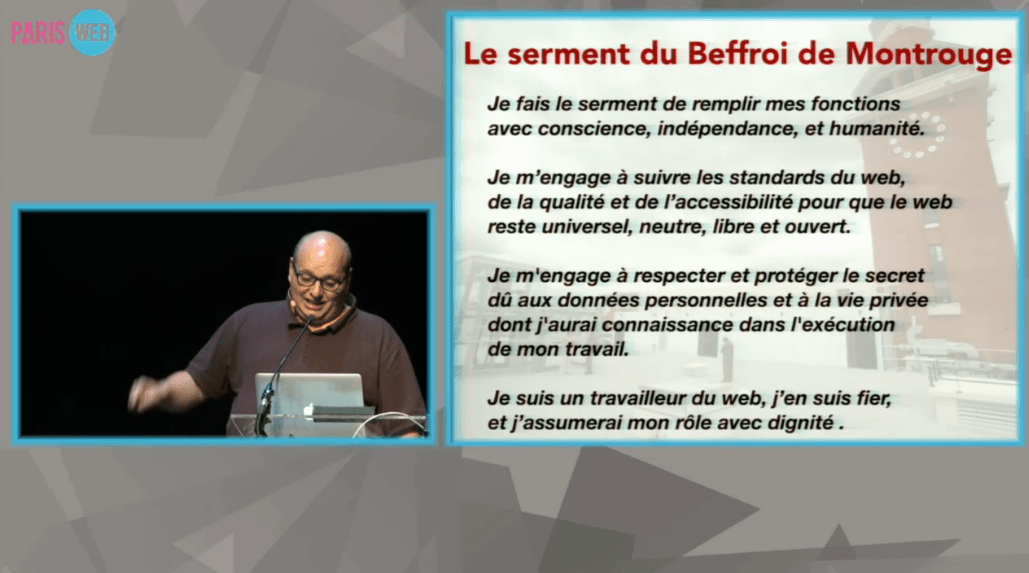 Alors il nous a incité à prêter le serment du développeur, nous engageant de respecter la vie privée, les standards ouverts, l’accessibilité, l’ouverture et la neutralité. Et à être fier de notre métier !