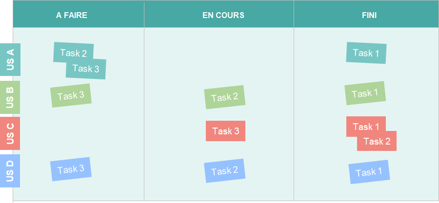 La principale différence est que seules les US transitent du début à la fin du board, et on ne rend pas visible leurs check lists de tâches internes. L’intérêt est de ne pas ajouter des détails spécifiques à l’US qui nuiraient à la clarté nécessaire pour que l’équipe prenne des décisions efficaces au quotidien.
