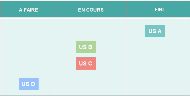 - La première conséquence est de suivre un état par US. Donc au lieu de se dire “J’ai effectué 70% de l’US” ou “j’ai fait 7 taches sur 10”, on ne s’attarde que sur la colonne dans laquelle il est, ou s’il présente des points de blocage. L’équipe a ainsi une vision plus synthétique de l’évolution de la fonctionnalité.