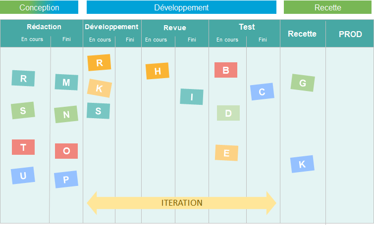 Le cycle de vie des User Stories en amont de l’itération (“en cours de rédaction”, “prêt à développer” etc) est donc géré par le PO et n’est pas visible par le reste de l’équipe.