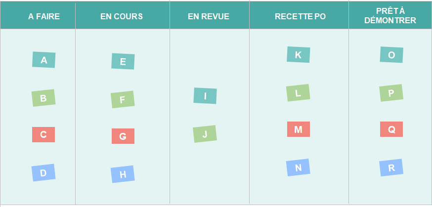Une colonne correspond idéalement à un type d’activité qu’un collaborateur peut effectuer seul ; le passage d’une colonne à une autre formalise le fait que l’US passe à un autre état et est prise en charge par une autre personne. Cette transition répond à une règle, un contrat formalisé et accepté par l’équipe, appelée “Definition of Done” (ou DoD).