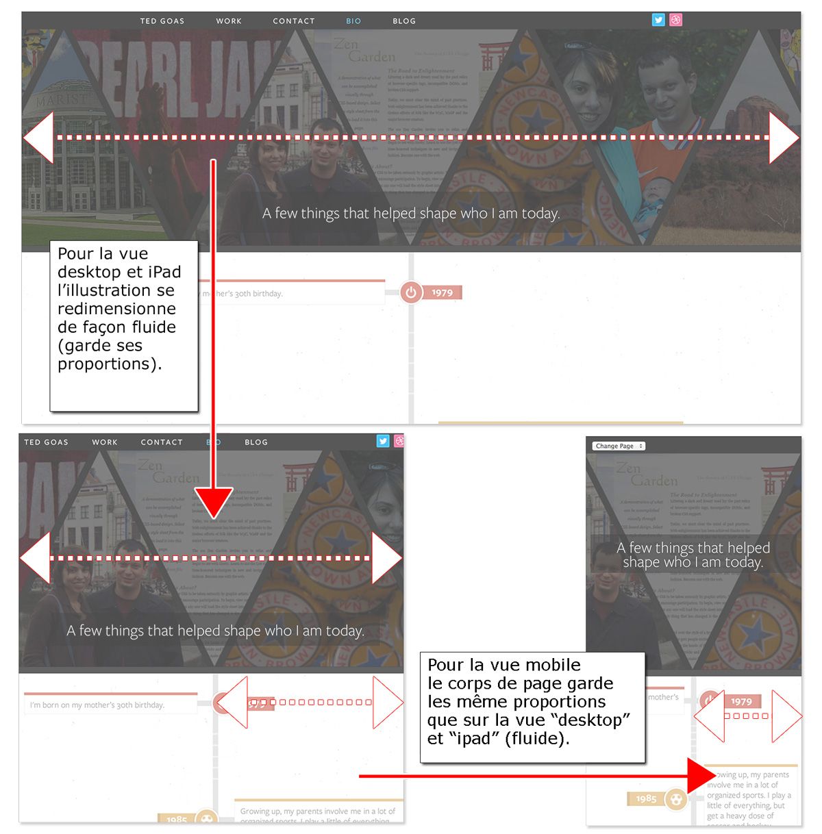 Responsive fluide (redimensionnement élastique des éléments du site à la résolution de l’écran) ex: http://www.tedgoas.com/bio/ http://trentwalton.com/