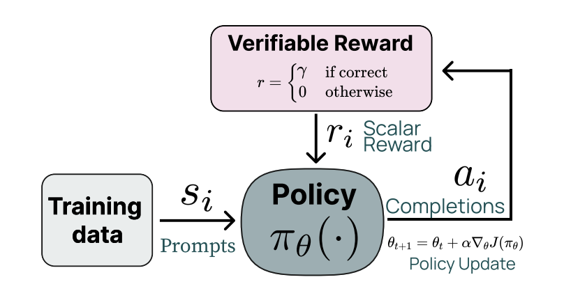 La sortie en 2024 de la série de modèles « o1 » d'OpenAI a marqué une étape importante : ces modèles sont entraînés spécifiquement pour raisonner et utiliser le Chain of Thought (CoT) de manière naturelle [9]. Suivi par la sortie de DeepSeek-R1 [10], qui a fait sensation en permettant à la communauté Open-Source de découvrir comment appliquer le Reinforcement Learning from Verifiable Rewards (RLVR) [11] de manière efficiente. Au lieu de demander à un Reward Model de juger chaque réponse, on donne une récompense automatique dès qu’on peut vérifier la réponse (calcul juste, fait vérifiable, code qui compile). Mais alors concrètement, qu’est ce que le RLVR ?