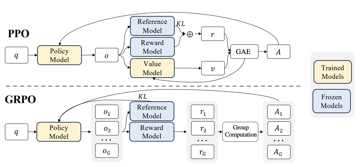 GRPO (bas). Pour un même prompt (q), la policy échantillonne plusieurs réponses (o1, o2, …). La fonction de récompense note (r) chaque réponse, puis on calcule un avantage (A) relatif au groupe en comparant ces scores au sein de la même question. Il n’y a pas de critic; la mise à jour favorise les réponses au-dessus de la moyenne avec une régularisation KL vers le modèle de référence pour rester proche d’un comportement sûr. (source : DeepSeek-AI, 2024)