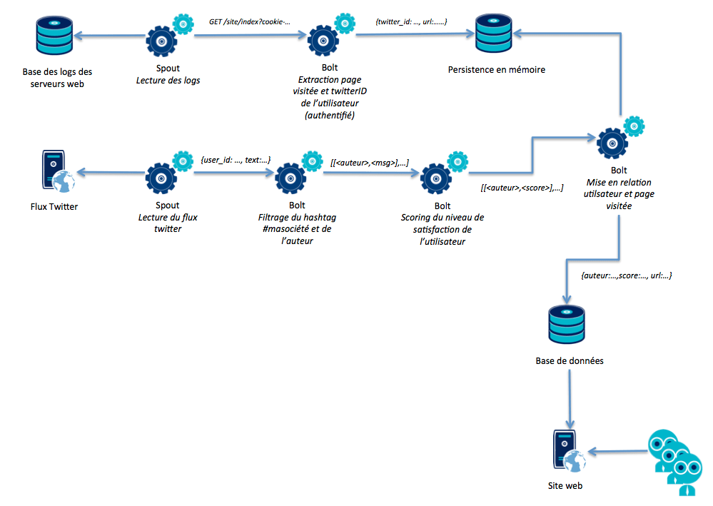 Ne sont pas de même nature, n'ont pas la même fréquence d'émission ni le même volume de données. Ce sont donc deux spouts qui s'y connectent, en lisent le contenu à une fréquence adaptée à chaque source de donnée et envoient chacun sur la topologie un stream contenant les informations utiles aux analyses que l'on souhaite effectuer.