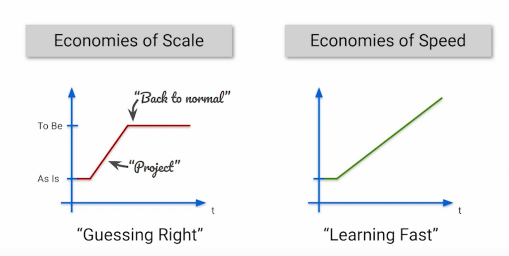 Or, faire des choix engageants au tout début d’un projet, c’est-à-dire au moment où l’on en sait le moins, est la pire chose que l’on pourrait s’infliger et infliger aux équipes de développement.
