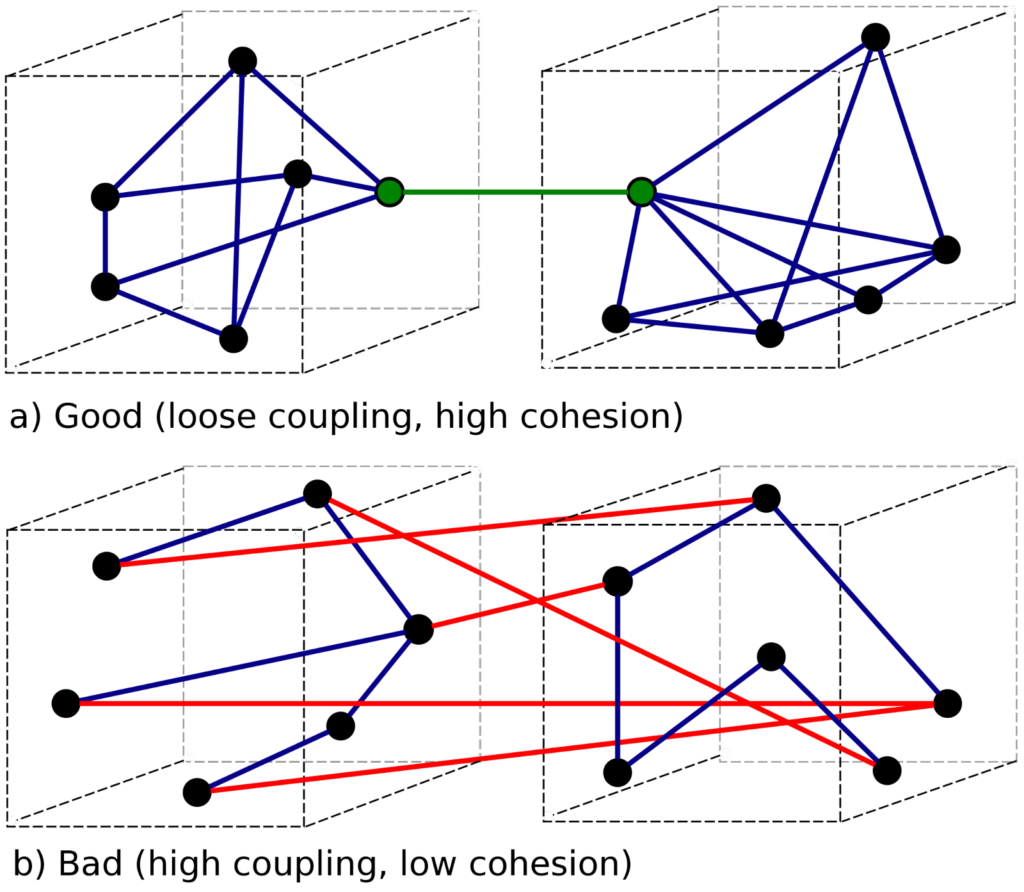 ~Les architectes à la quête du graal : Forte ~ <strong>cohésion</strong> ~ et ~ <strong>couplage</strong> ~ faible. Source : <a href="https://en.wikipedia.org/wiki/Cohesion(computer_science)#/media/File:CouplingVsCohesion.svg" target="blank" rel="noreferrer noopener">Wikipedia</a>~