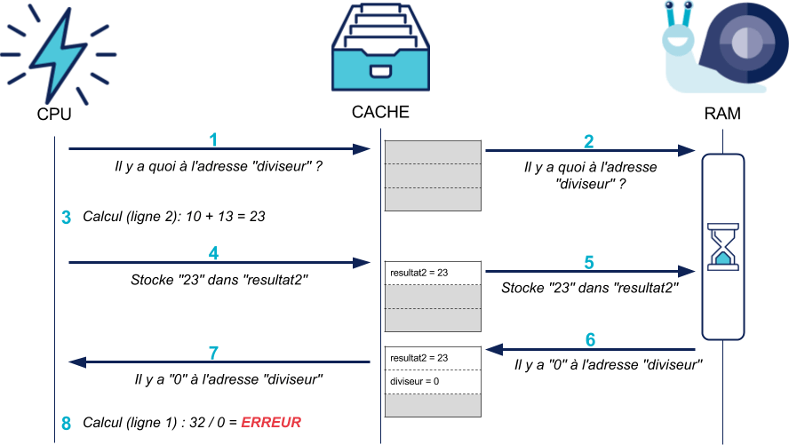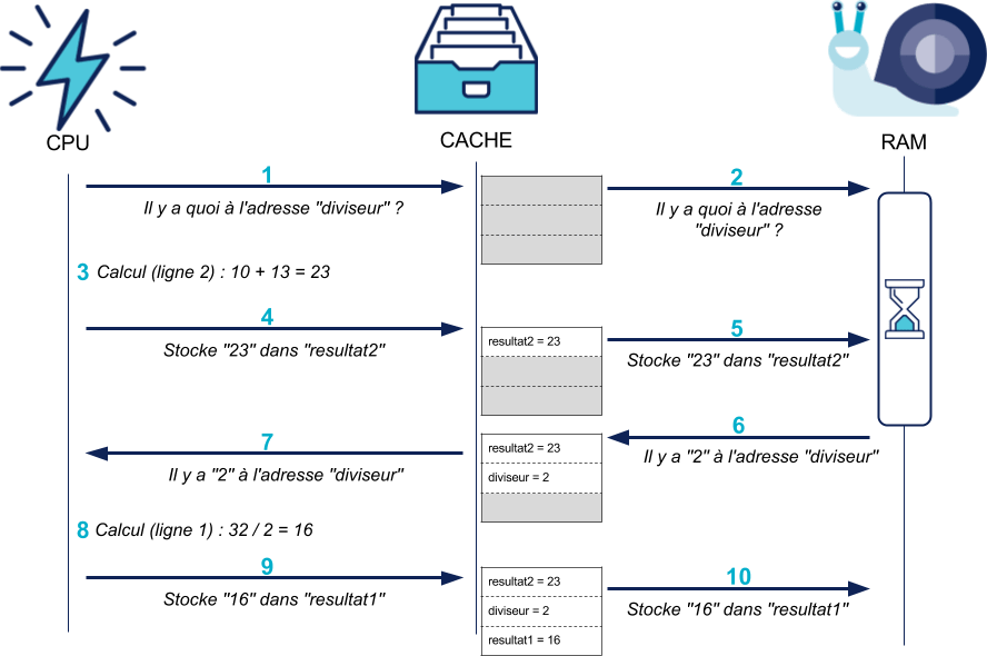 Le cache stocke la valeur récupérée et est capable de la renvoyer plus rapidement au CPU (jusqu'à 200 fois plus rapidement que la RAM) s'il la demande à nouveau :