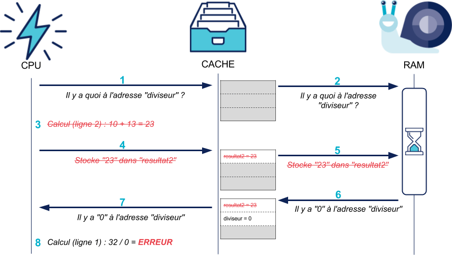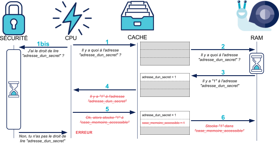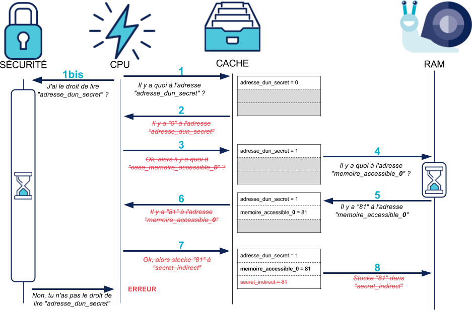 Le résultat est le même que pour notre division par zéro ci-dessus : dès que le CPU se rend compte que l'accès à adresse_dun_secret est interdit, il lève une erreur et annule les modifications des instructions suivantes.