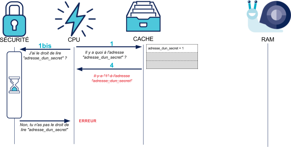 A ce stade, les valeurs lues depuis la RAM restent chargées en cache. Est-ce là que Meltdown attaque ? Non, ça ne pose pas de problème de sécurité à priori, puisque les vérifications de sécurité sont toujours exécutées :