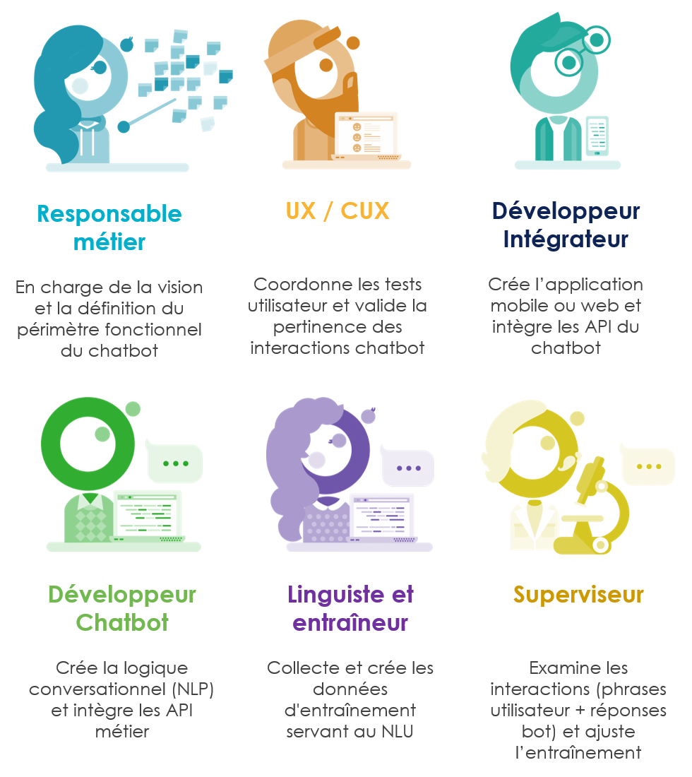 Responsable métier / Product Owner CUX (Conversational User Experience) Développeur integrateur (front-end / mobile) Expert Blockchain Développeur Chatbot Linguiste / Entraîneur de bot Expert IA / Data-Scientist Chief Bot Officer Superviseur