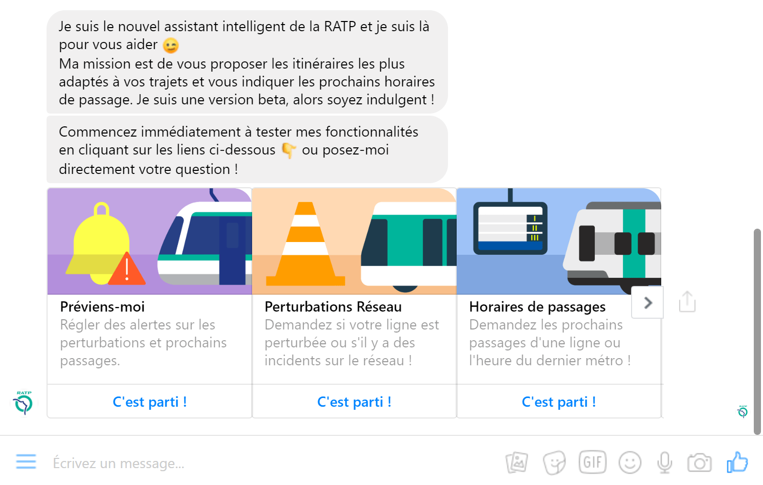 Le fait de ne pas orienter l'utilisateur ouvre un champ de possibilités de thématiques très large. Votre chatbot n'a surement pas été implémenté pour gérer toutes les demandes et l'utilisateur sera frustré si il obtient un "Je n'ai pas compris" dès sa première interaction. Nous recommandons que le chatbot se présente et précise son périmètre via une introduction rapide. En bonus, l'utilisation de boutons de quick-reply permet de router rapidement l'utilisateur vers les bons embranchements de l'arbre conversationnel.