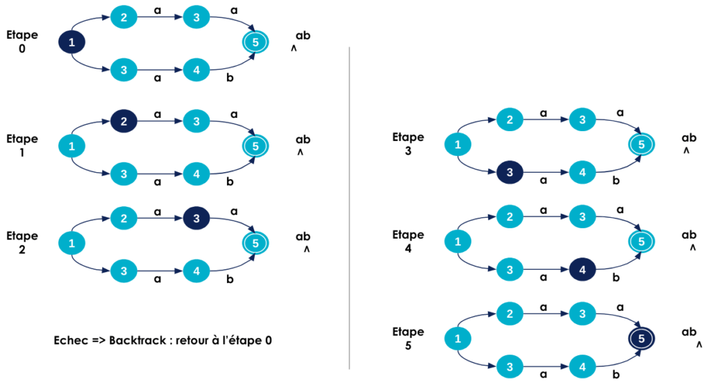 Voici un exemple d’exécution de l’expression régulière aa|ab pour “ab” :