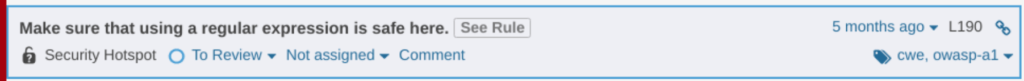 Ainsi, en complément de votre vigilance, les outils d’analyse de code ou SAST (Static Application Security Testing) sont indispensables pour détecter les expressions régulières vulnérables. Voici un exemple d’alerte remontée par SonarQube :