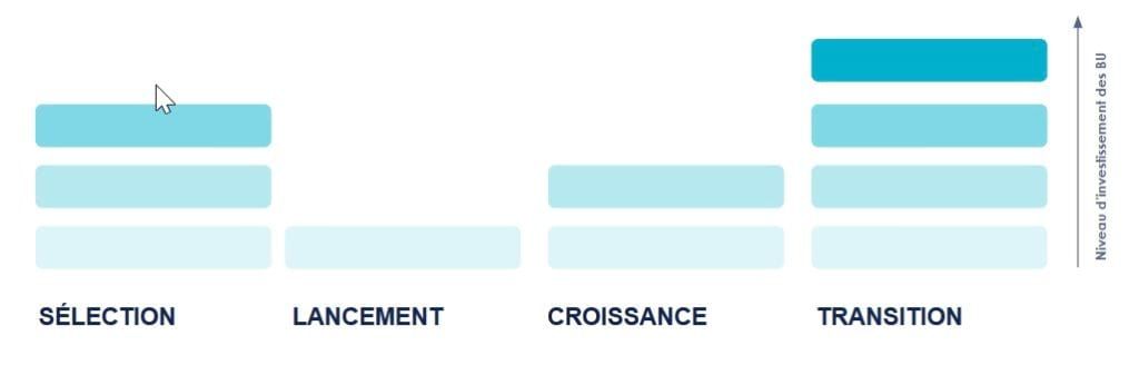 Progressivement, la BU doit être plus impliquée, en phase de croissance pour recruter de nouveaux utilisateurs , mettre en contact avec des partenaires, assurer les process (sécurité, RGPD, juridique, ...) et sécuriser en amont du budget pour la reprise à venir.