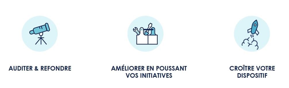- Croître le dispositif : votre dispositif fonctionne mais est encore trop limité ? Nous vous aidons à le passer à large échelle, au niveau d'autres directions, voire filiales à l'international.
